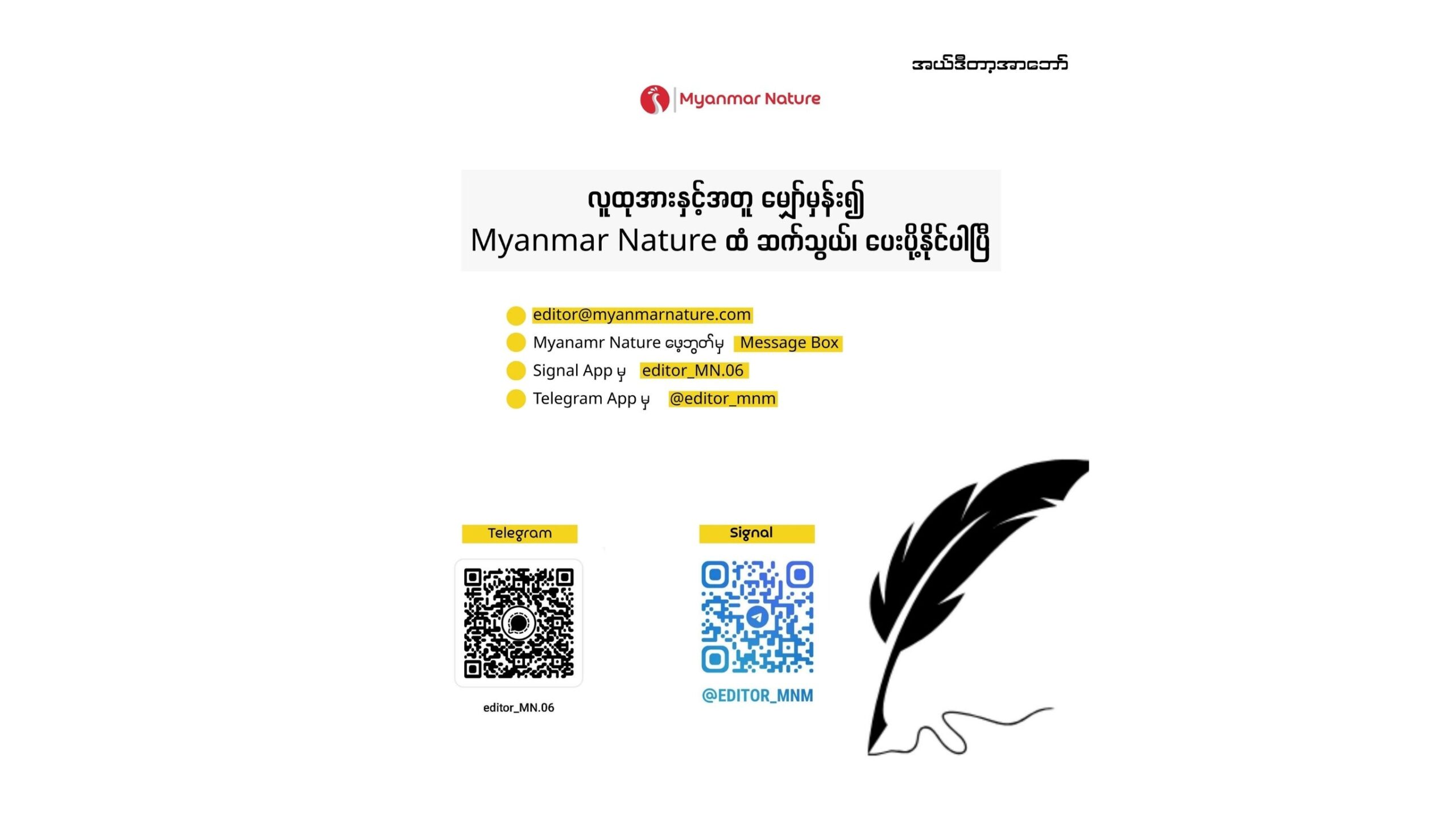 editor@myanmarnature.com မှဖြစ်စေ၊ Myanamr Nature သတင်းဌာန ဖေ့ဘွတ်၏ Message Box မှ ဖြစ်စေ၊ Signal အကောင့်ဖြစ်သည့် editor_MN.06 မှဖြစ်စေ၊ @editor_mnm မှဖြစ်စေ ပေးပို့နိုင်ပါသည်။